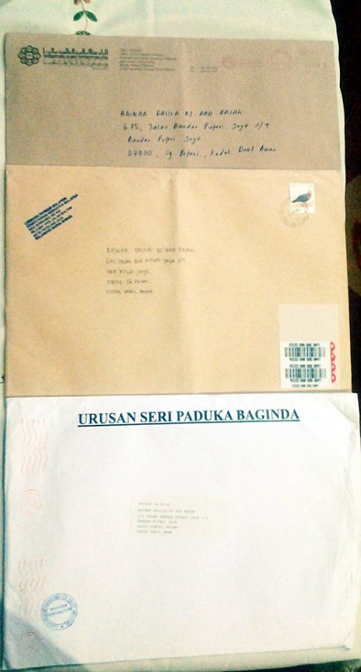 d) Sampul surat beralamat sendiri + Setem RM1 + Pos Berdaftar RM 2.20